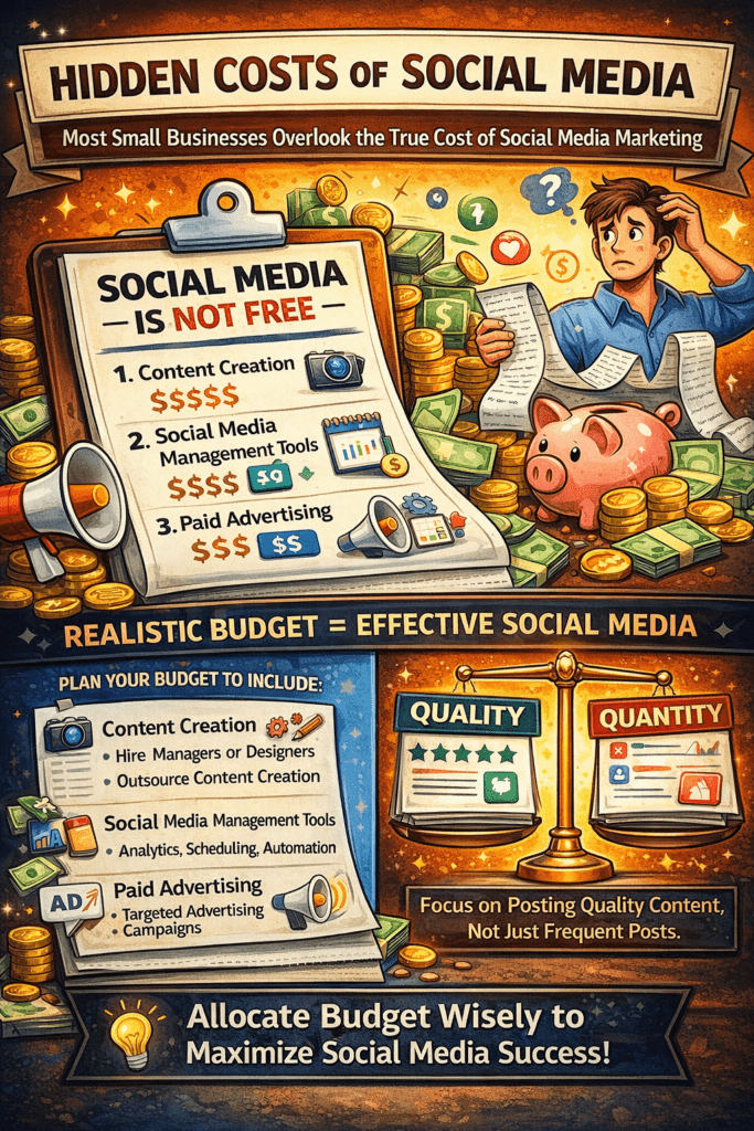 Many small businesses overlook the hidden cost of Social media marketing. These could include hiring a social media manager, outsourcing content tasks, investing in content creation and graphic design, or running paid advertising campaigns. Most businesses allocate a budget for social media marketing to ensure success and effectiveness, quickly dispelling the myth of ‘free’ social media.