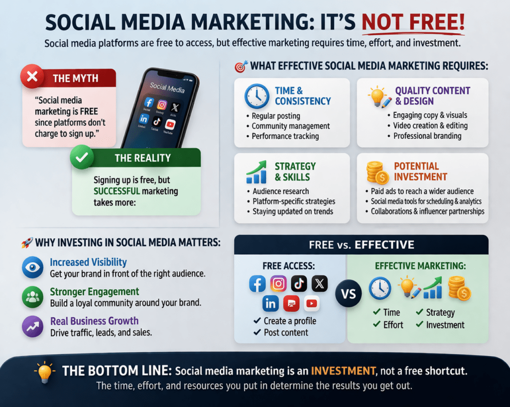 Social media platforms offer free access to businesses, leading to the myth that social media marketing is entirely free. While it’s true that signing up and creating profiles on social platforms is free, effective social media marketing requires time, effort, and potential investment to make maximum gains.
